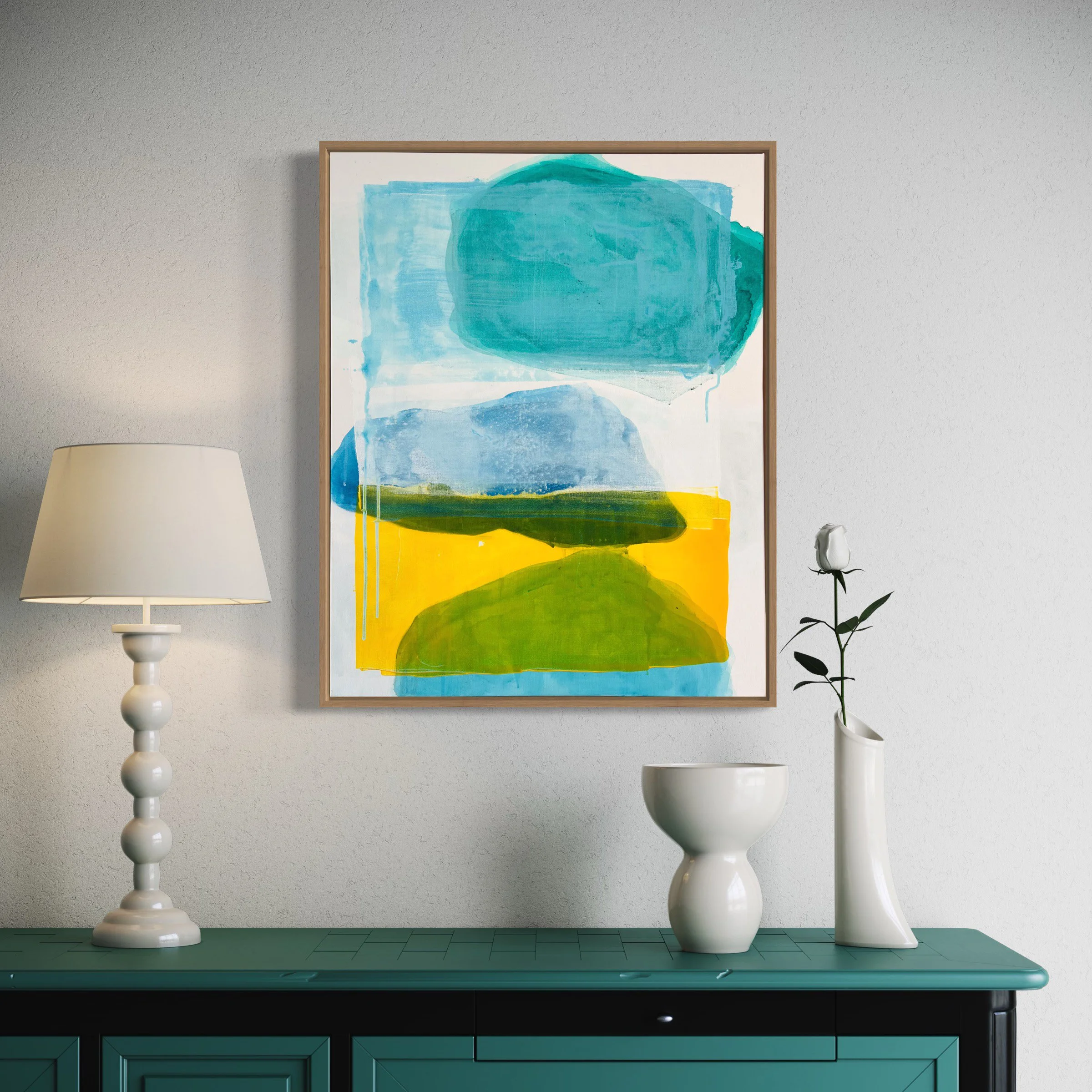 Framed in a natural maple float frame.